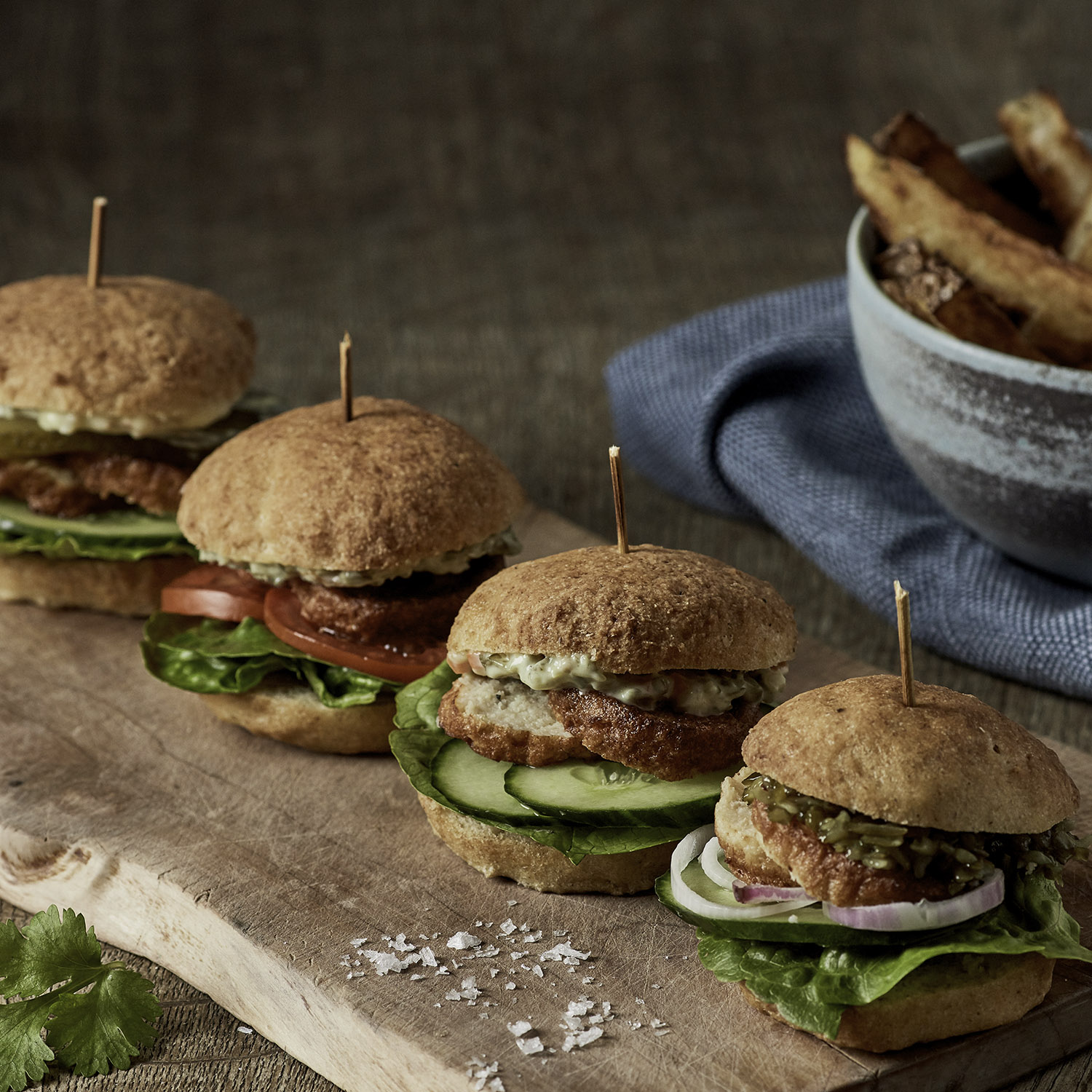 Varm fiskefrikadellerne i ovnen i ca. 15 minutter ved 180 grader. Lun burgerbollerne. Rens salaten/babyspinaten, så den er klar til at komme i burgerbollerne. Skyl agurken og skær den i skiver på skrå. Skyl tomaterne og skær dem i tykke skiver. Rens rødløget og skær i ringe. Hak de hele pickles fint. Lav din egen remoulade-relish eller køb den færdig i dit supermarked.
